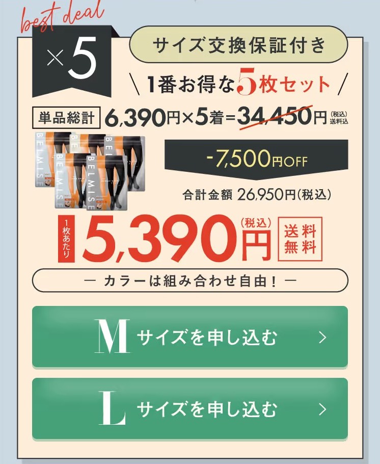 公式サイトでは「単品」「3着セット」「4着セット」「5着セット」の4つのプランが用意されていて、セット購入だと大幅割引(最大約7,500円OFF)に加えて送料無料となっているので、調査の通りAmazon、楽天市場、ヤフーショッピングで購入するよりも公式サイトが断然お得になります!